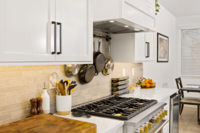 A new Karran QA-740-WH-PK1 sink, in a modern white finish, paired with the Karran KKF230SS faucet in stainless steel, created a sleek, cohesive workstation. Supporting the daily function of the kitchen, an American Standard 1.25 HP garbage disposal was installed to provide power and convenience with minimal noise — another thoughtful addition in a project that balanced aesthetics and practicality throughout.