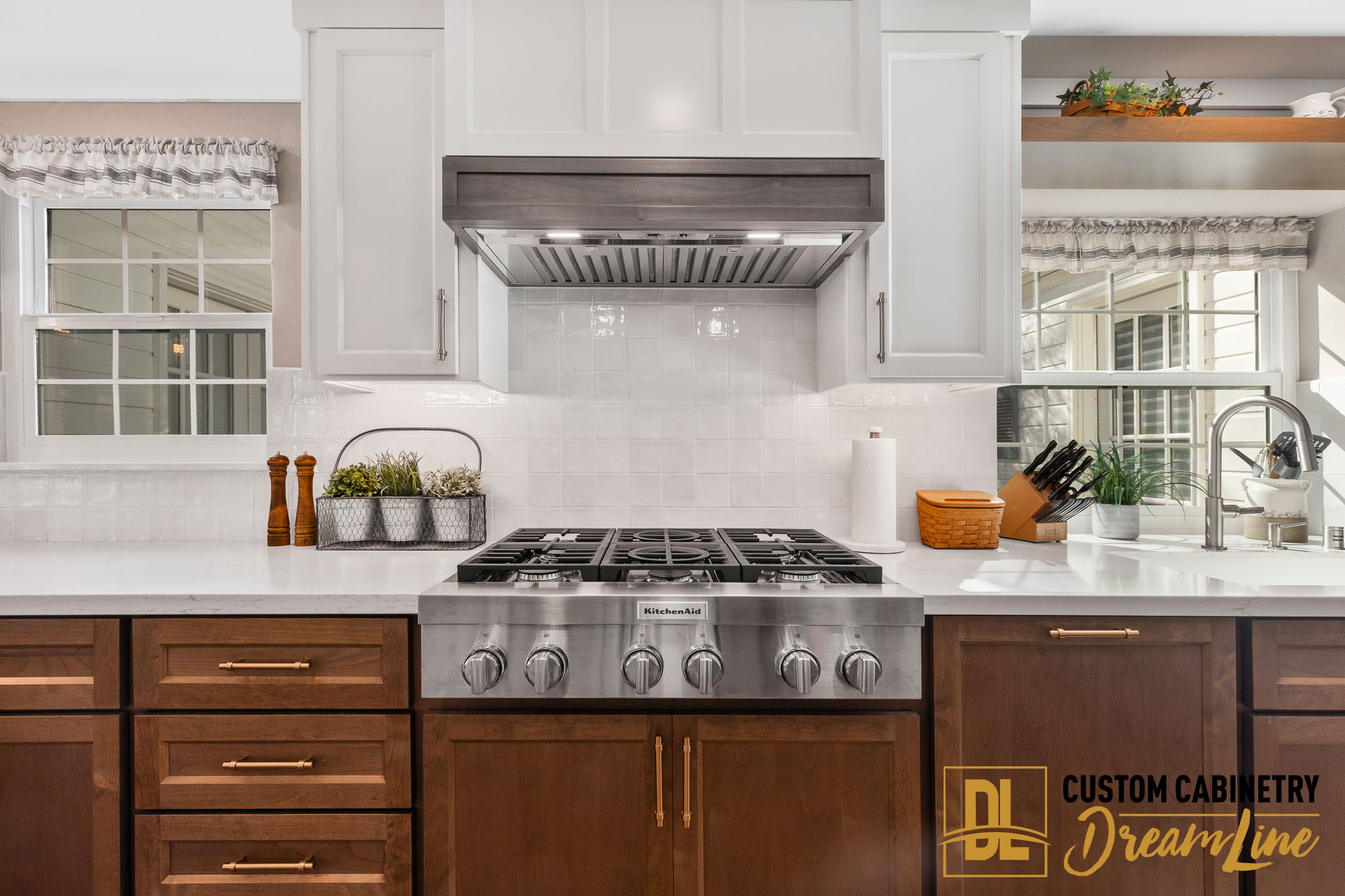 The backsplash introduced another layer of charm and personality. Celine 4″ x 4″ Glossy Porcelain Floor & Wall Tile in White, paired with 19 pieces of matching trim and Custom Grout #381 Bright White from Bedrosians, creates a crisp, classic backdrop that enhances the two-tone cabinetry and countertops beautifully.
